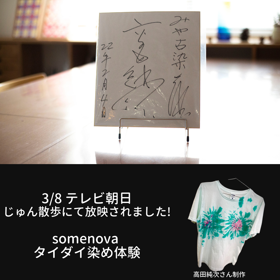 3月8日 テレビ朝日 「じゅん散歩」にてsomenova タイダイ体験が紹介されました。高田純次さんの自由奔放?なタイダイ染めにスタッフ全員冷や汗💦ものでしたけど、みやこ染を良くご存じで、とても嬉しく感じ […]