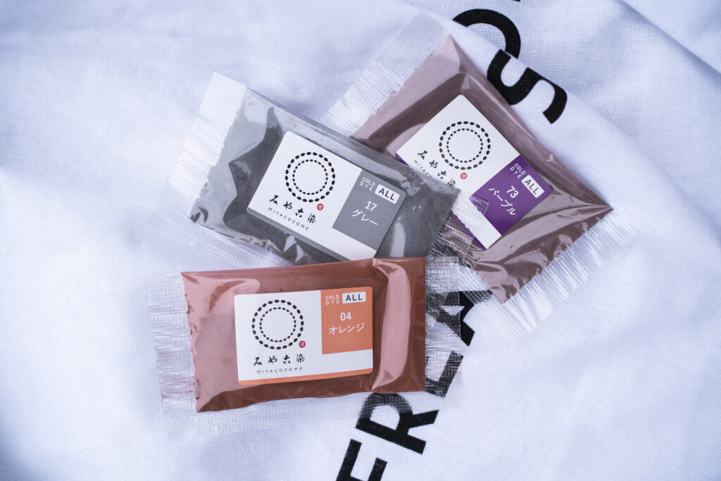 (3) 使用する染料は当社提供のみやこ染ブランドの「コールダイオール」 。お子様でも安心の低温(30℃以上)でやさしい色に染まる、原料を厳選した安心のECO(エコ)染料です。国内で、ひとつひとつ手づくりし、真心を込めて提供いたします。