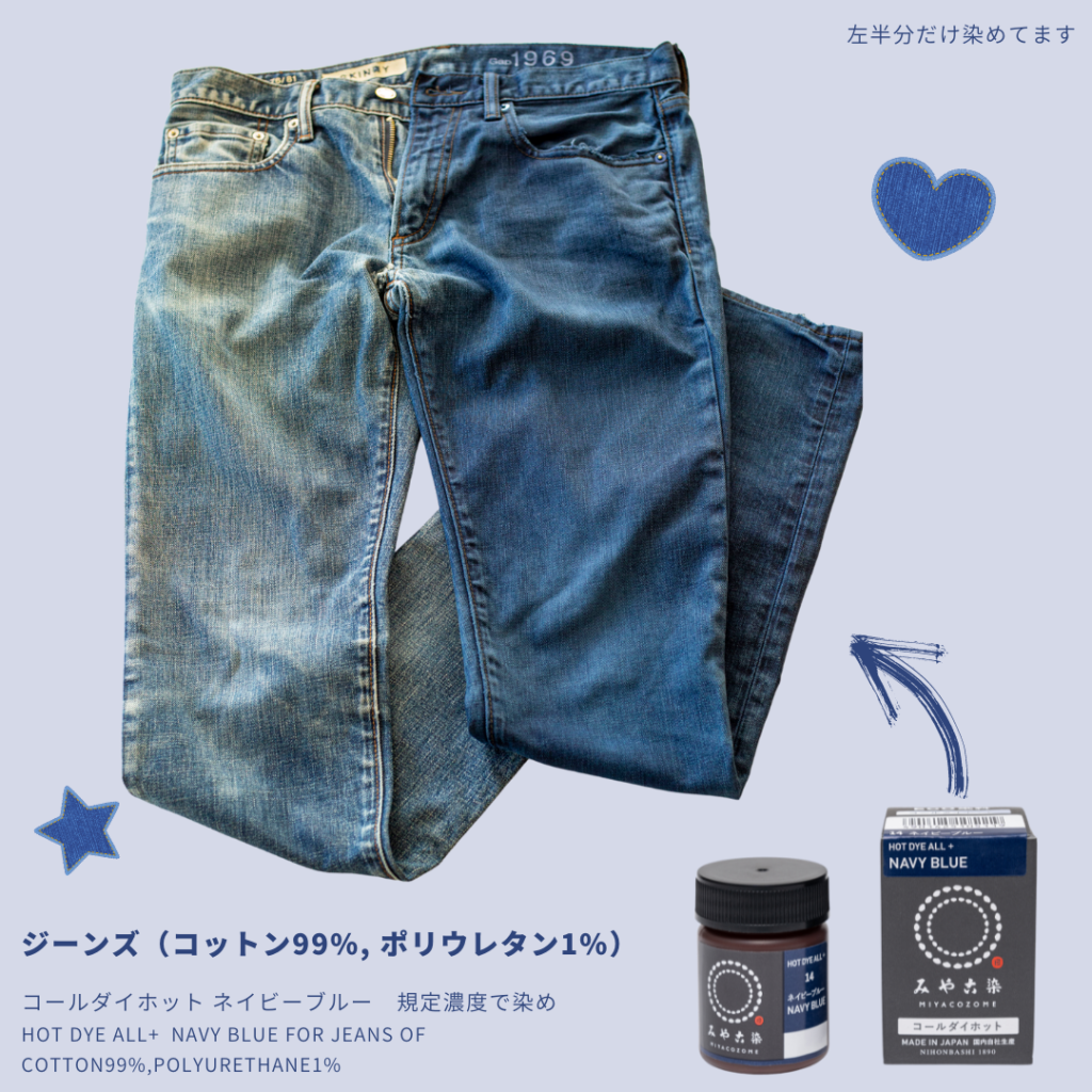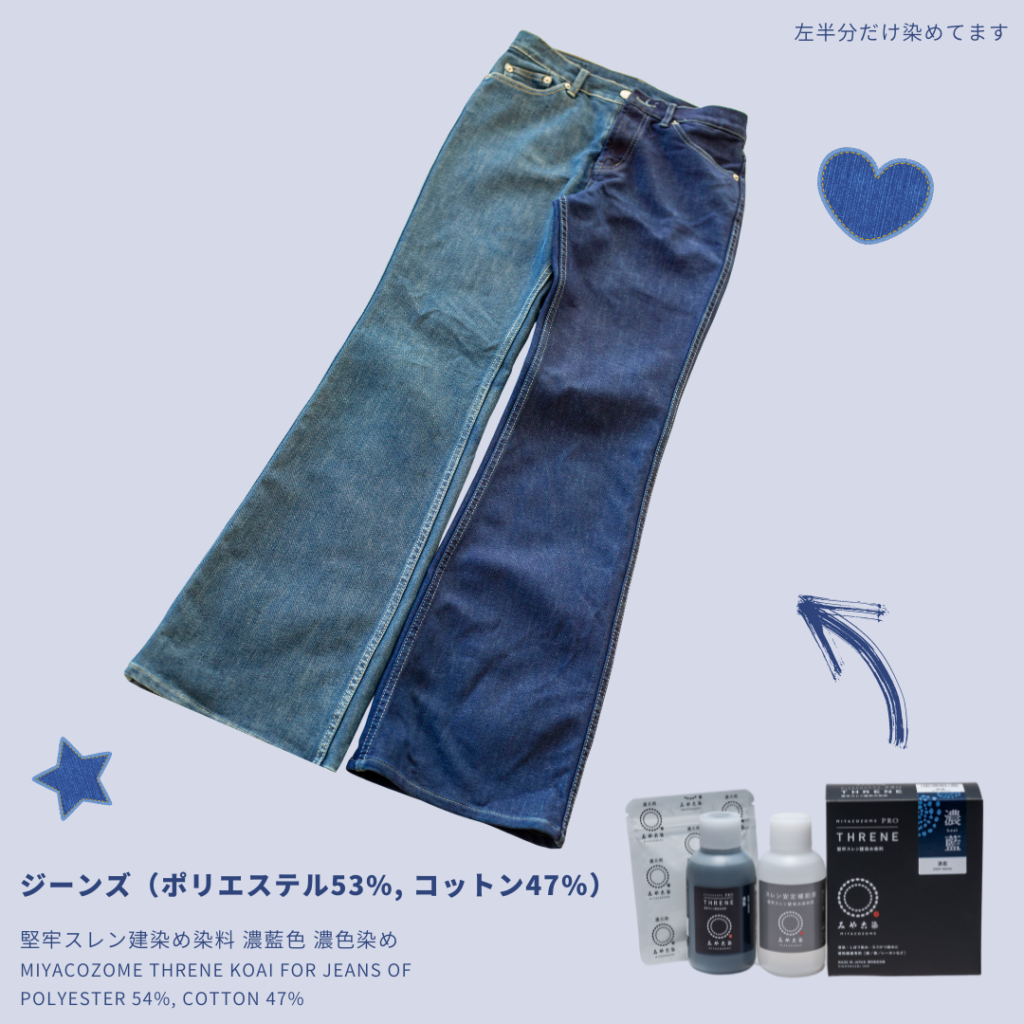 こちらでご紹介する染料はいずれもコットンジーンズなら染色可能です。