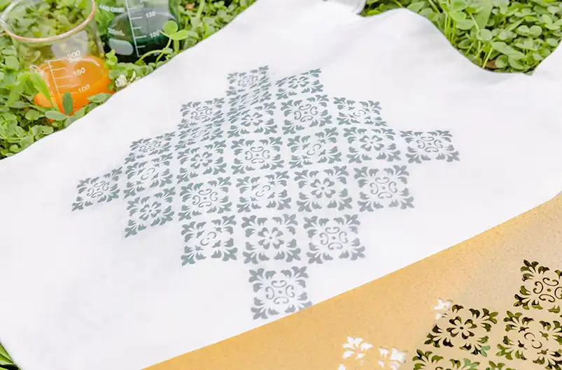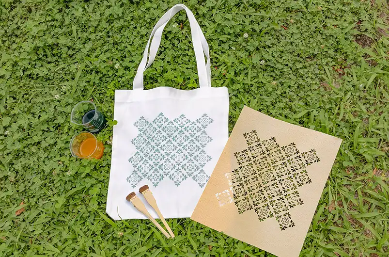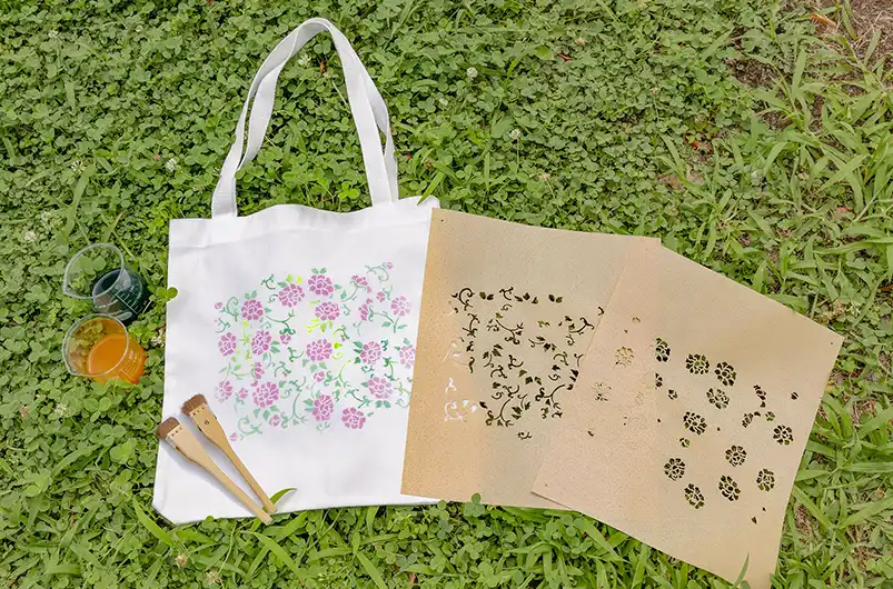 3種類の柄からお好みの1種類を選び、型紙と刷毛を使用して、トートバッグに更紗(さらさ)模様を染めていただくワークショップです。