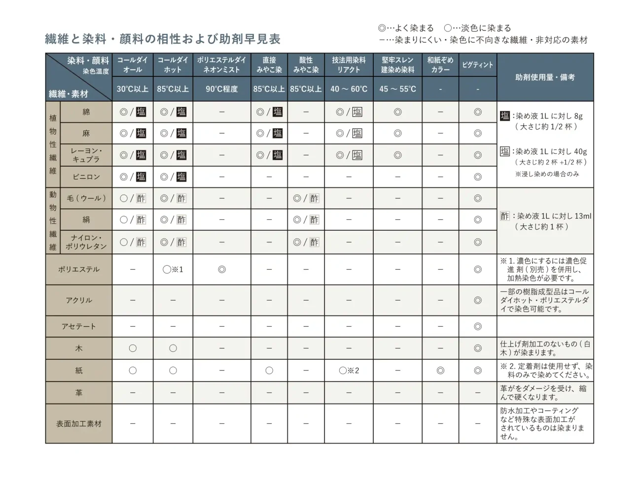 A.色を染める・つける商品として染料と顔料があります。必要に応じてお使い頂く各種助剤(色止剤、脱色剤、ポリエステル繊維の濃色促進剤など)や器具、布生地など素材も取り扱っております。染料・顔料と素材をセットにした便利なキットも各種ご用意しております。使い方、必要量、染まる素材などは染料・顔料により異なりますので、それぞれの詳細については商品一覧のページをご覧ください。