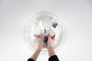 6, 水につけて置いたTシャツを取り出し、水気をギュッと絞る。