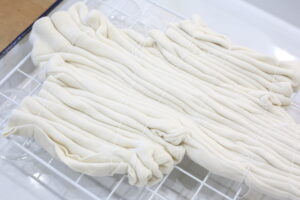 ①染めるものは汚れなどを落とし、水に浸した後ぎゅっと絞っておきます。