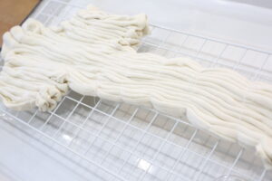 ②山折り、谷折りを繰り返して屏風畳みにし、折ったところが崩れないように糸や輪ゴムで固定します。