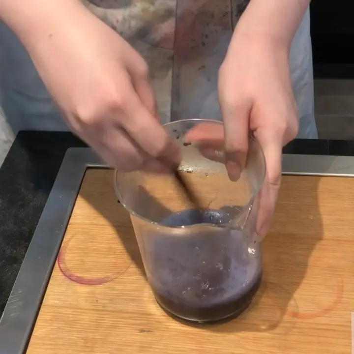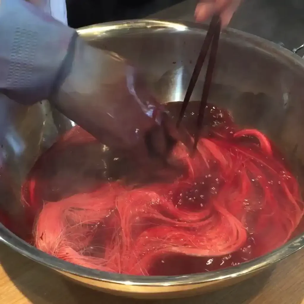 (動画では2gの染料を250mlの熱湯で溶き、さらに250mlの熱湯を入れてよくかき混ぜ、500mlお湯で希釈しています)