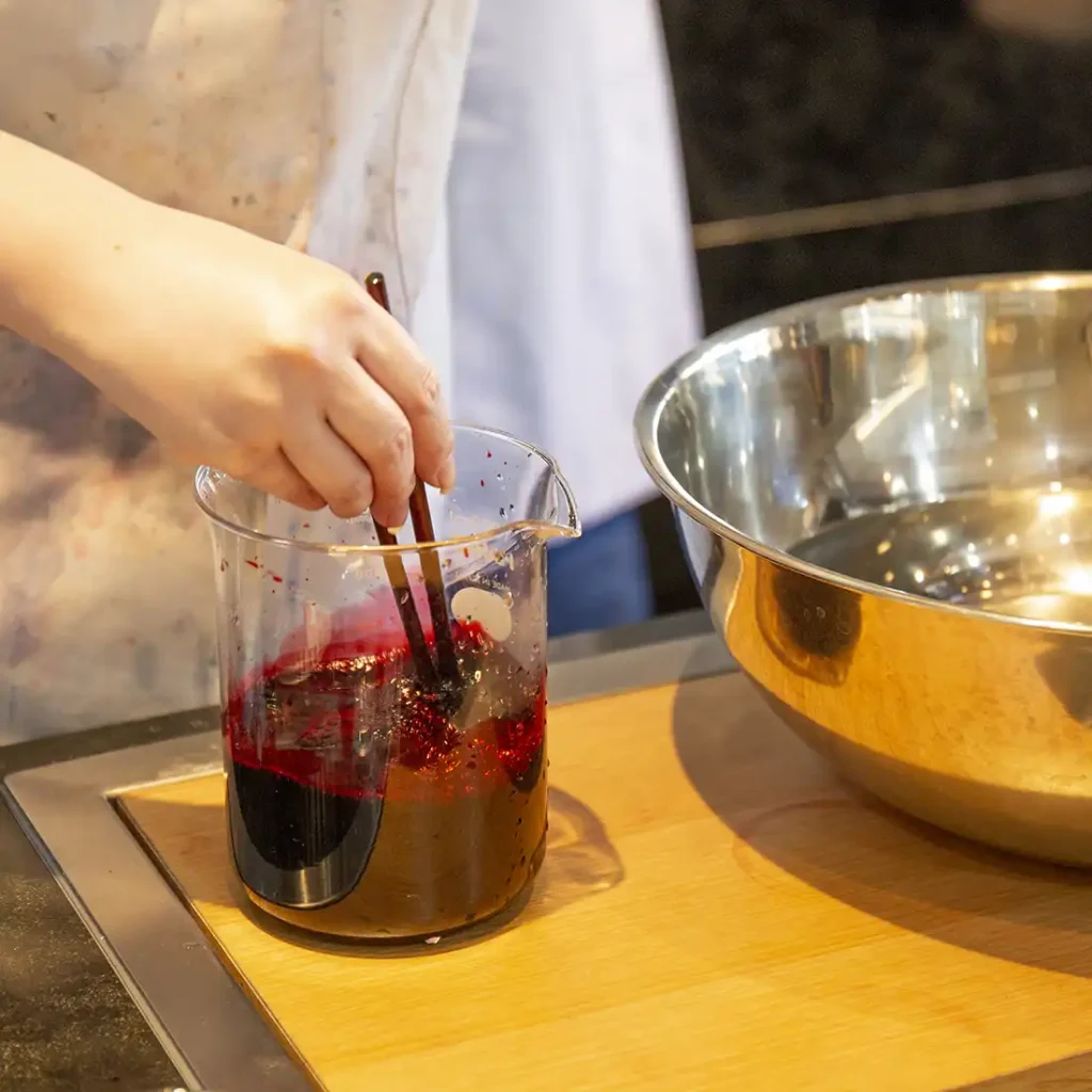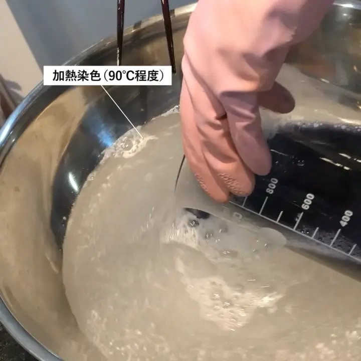 最初は少量の湯量でしっかり染料を溶かして、その後、必要量のお湯(85℃以上)で希釈します。