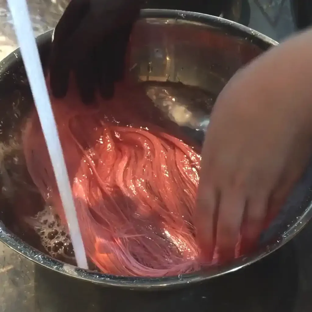 ウィッグが淡く染まったところで、いったん染料から取り出し、軽く洗います。