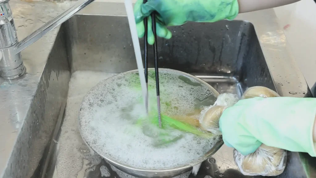 軽く水ですすいだ後、60℃のお湯に台所用液体中性洗剤を溶かし、5分間洗います。