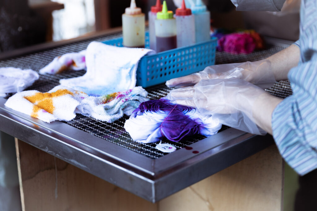 ワークショップの指導はお馴染みのタイダイズ。楽しいトークで愉快に染めていくプロ集団にも、みやこ染のリアクト染料は信頼を得て、ワークショップでお使い頂いています。