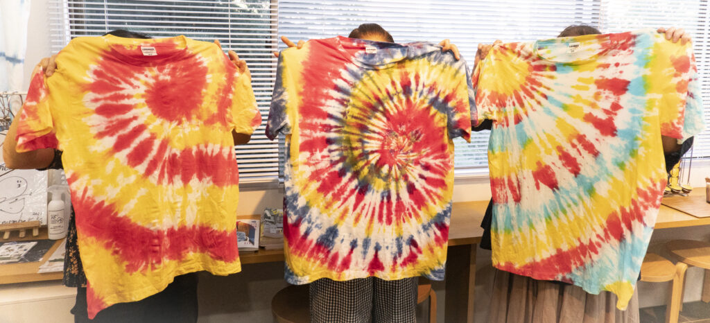 イメージの異なるタイダイ染め2種(渦巻き絞りや寄せ絞り)を中心に個性豊かなタイダイ染めの世界が楽しめます。染めて楽しい、着て楽しい季節の到来です。