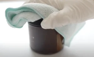 つまみ細工の小さな生地に相応しく、大きな容器は使わず、付属の染色ボトルで手軽に染めることが