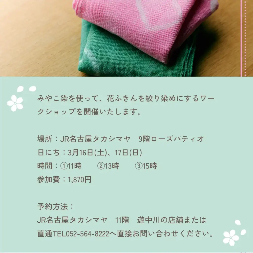 3月16〜17日・名古屋タカシマヤにて中川政七商店・花ふきん染め体験ワークショップ開催