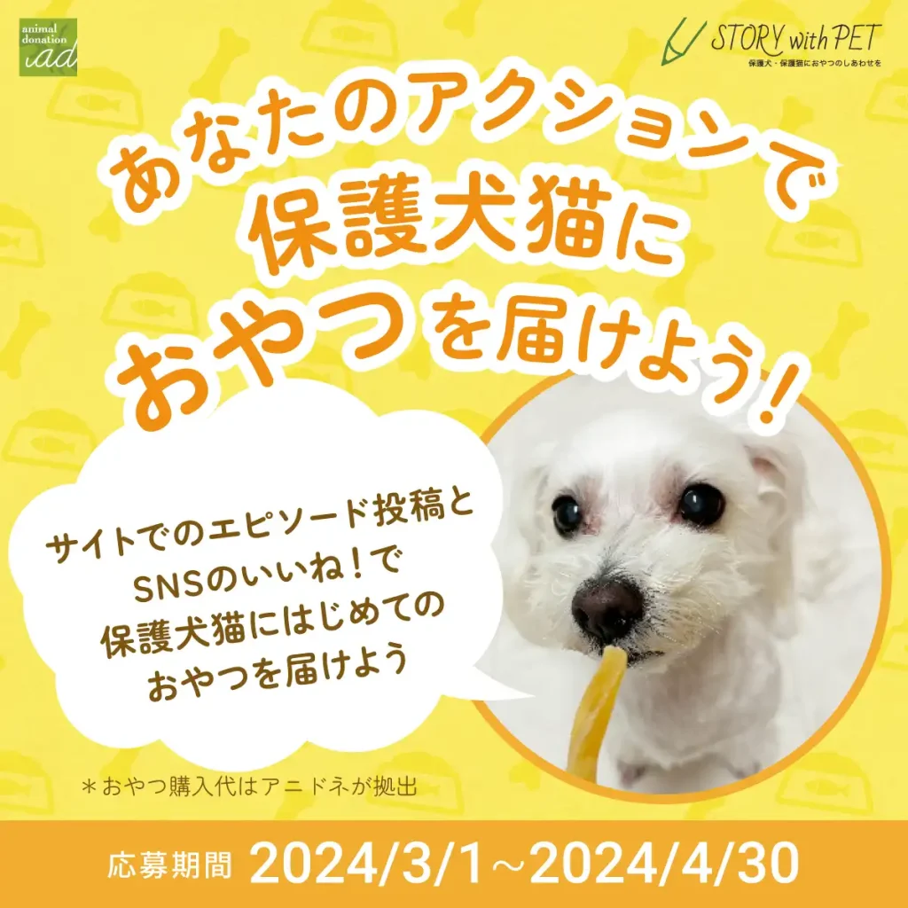 ペットの画像を投稿すると、1投稿100円+1いいね50円がおやつとなって保護犬猫へ届けられる寄付企画です!