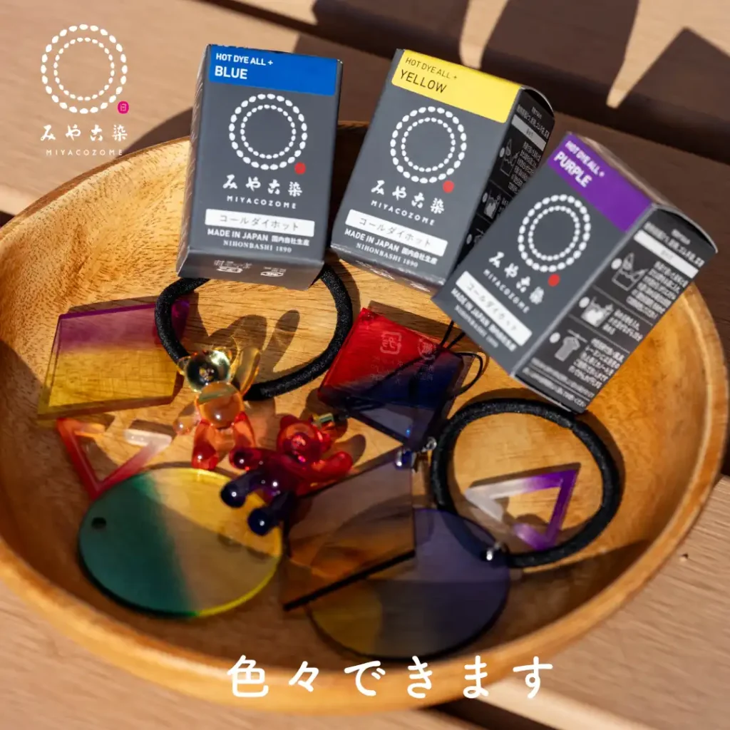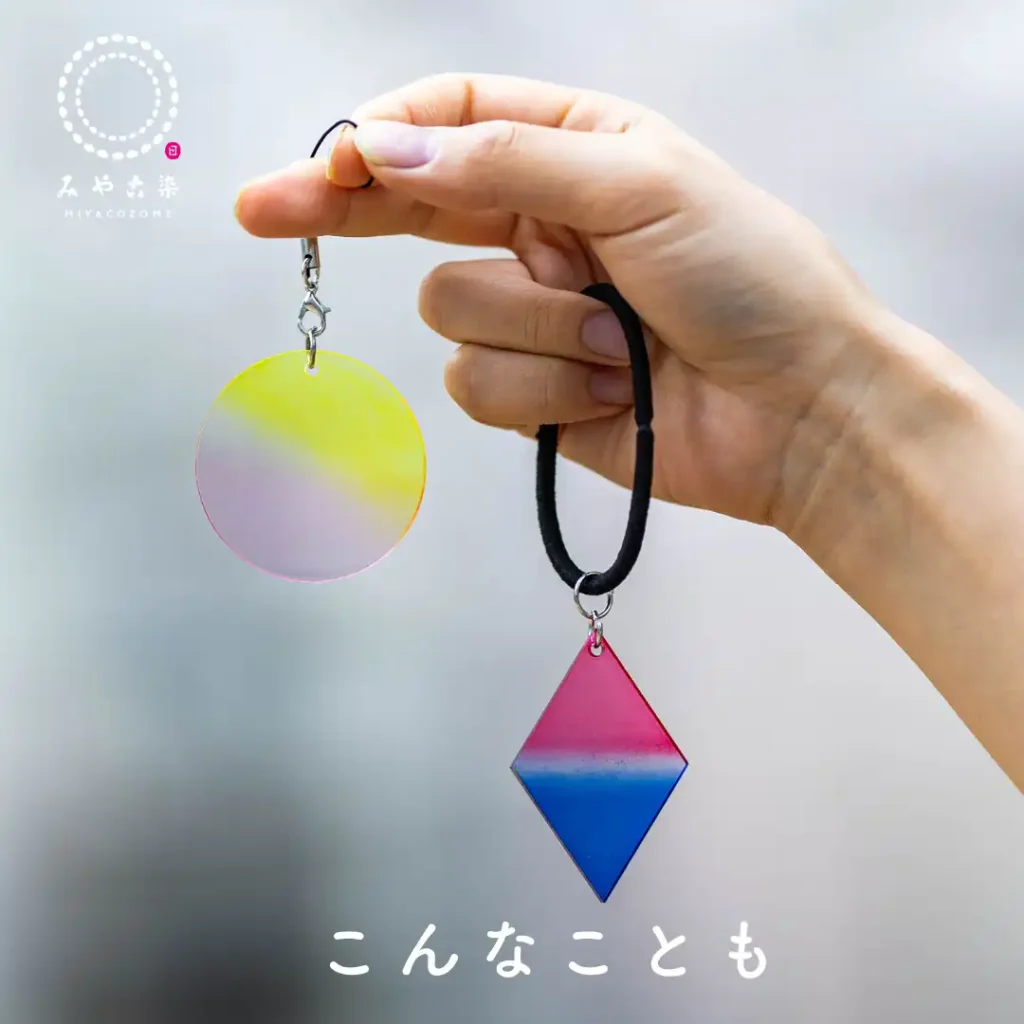 みやこ染の染料で、アクリル樹脂を染めてアクセサリー(ストラップ・イヤーカフ)を作ります。