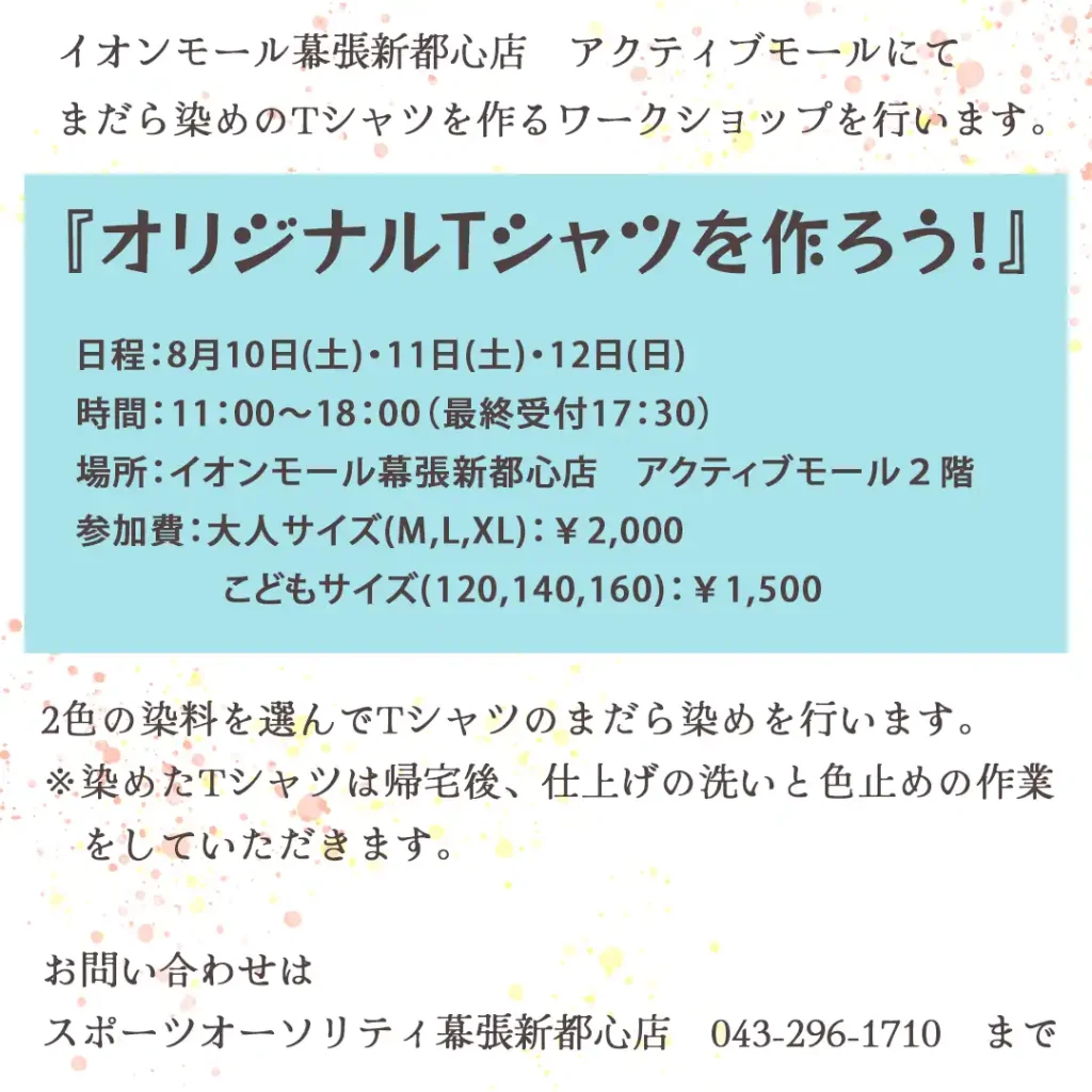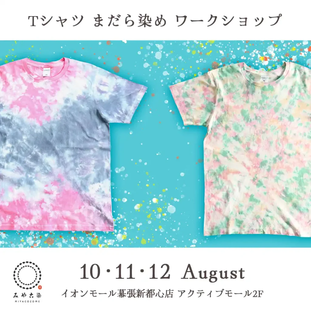 2024年8月10日(土)・11日(日)・12日(月)の3日間、イオンモール幕張新都心店、アクティブモール2階のイベントスペースにて、まだら染めのTシャツを作るワークショップを行います。