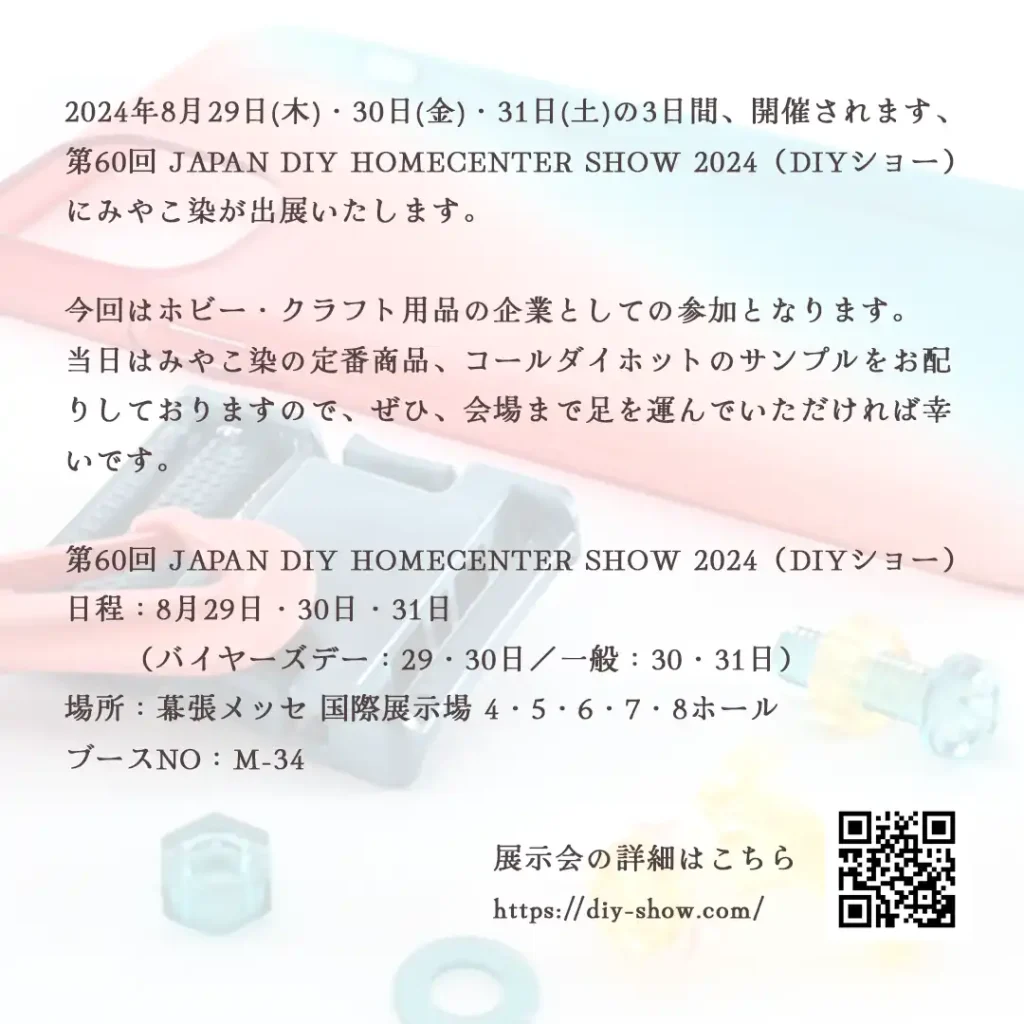2024年8月29日(木)・30日(金)・31日(土)の3日間、開催されます、第60回 JAPAN DIY HOMECENTER SHOW 2024(DIYショー)にみやこ染が出展いたします。