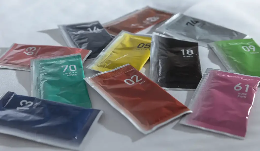 このセットには名前の通り、通常では溶器に20g入りとなっている染料が、3色、10gずつのフィルムパッケージに入っており、少量から染料を使ってみたい方やいろいろな色を試したい方におすすめの商品となっております。