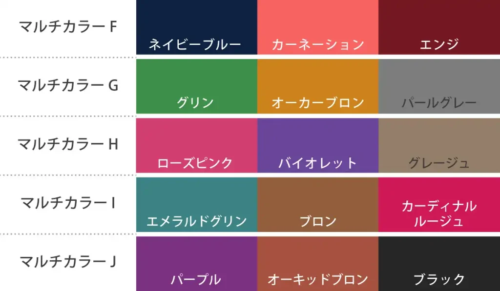 セットカラーは「同系色セット」が10パターン、「マルチカラーセット」が10パターンあり、その中からお好みのセットを選んでご購入いただけます。