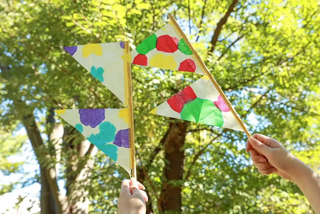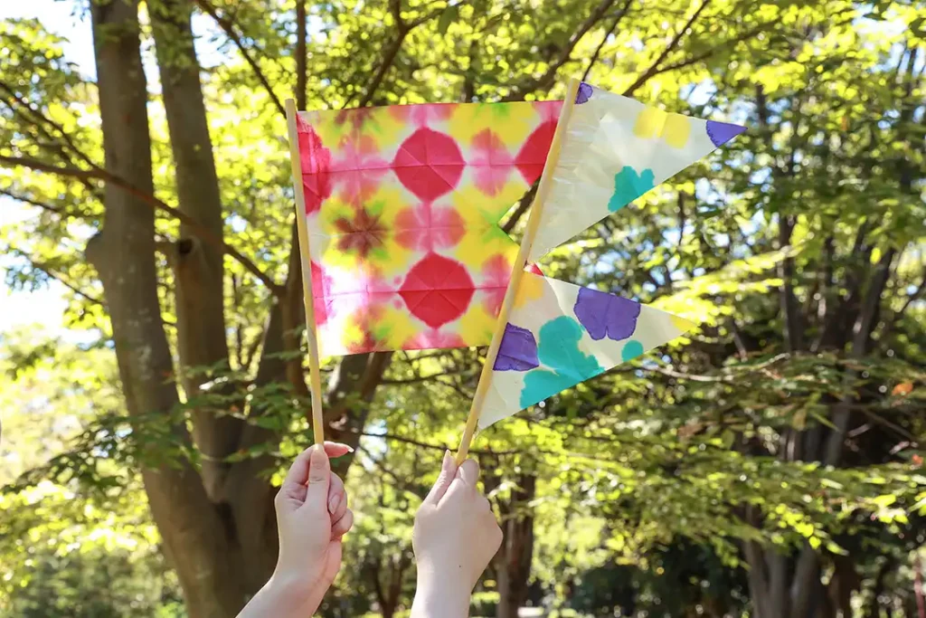 和紙の折り染めを使って、世界に一つだけのオリジナルフラッグを作ります。
