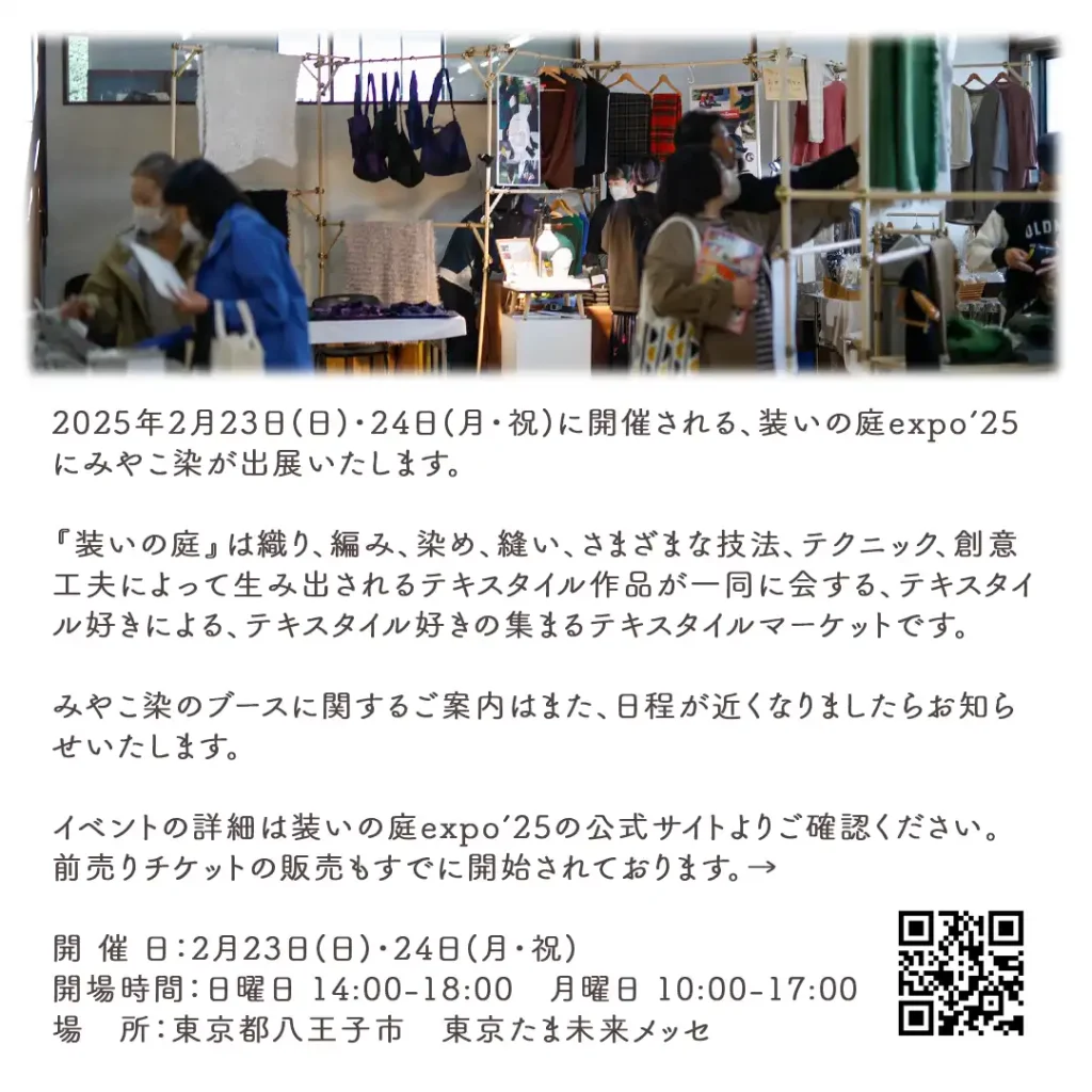 2025年2月23日(日)・24日(月・祝)に開催される、装いの庭expo’25にみやこ染が出展いたします。