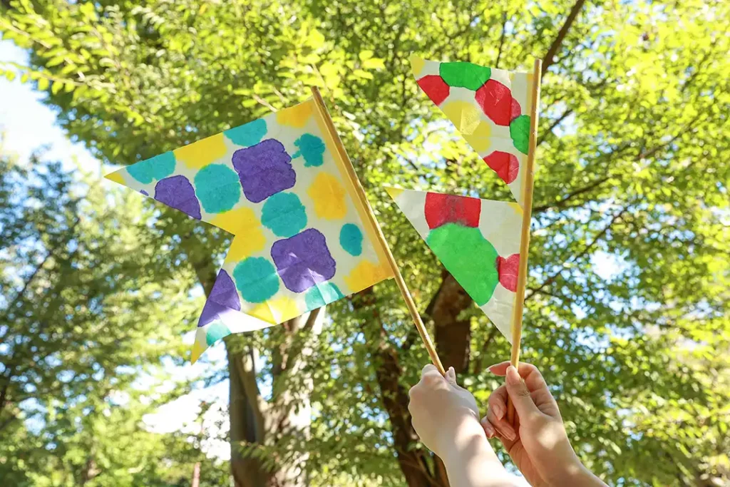 和紙の折り染めを使って、世界に一つだけのオリジナルフラッグを作ります。