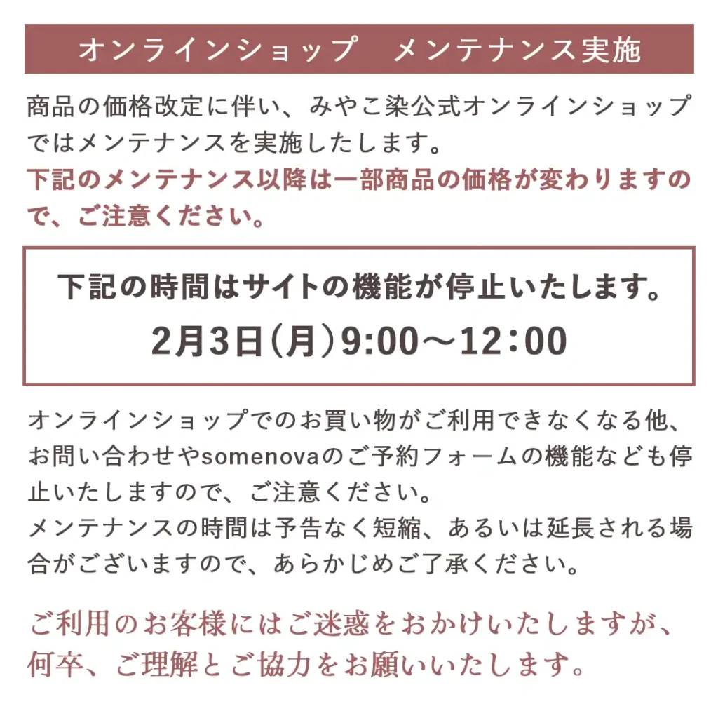 オンラインショップでのお買い物がご利用できなくなる他、お問い合わせやsomenovaのご予約フォームの機能なども停止いたしますので、ご注意ください。