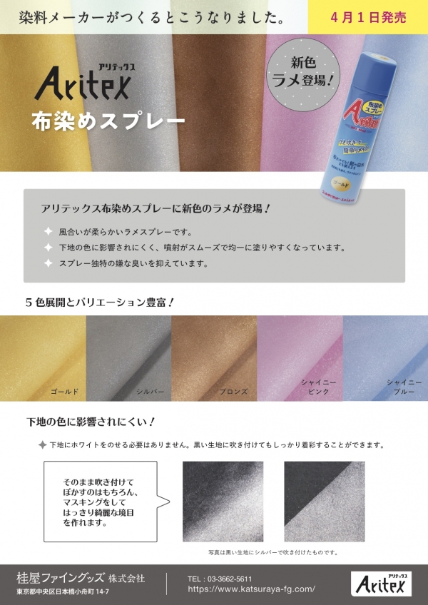 布だけでなく、白木・紙・コルク等、水をはじかないものに使える布染めスプレー染料メーカーが作ると色生地にも使え、ゴワつきにくく、においが少ないと発売当初から好評のスプレーです。4月1日より、新たにラメ5色が発売されます。新 […]
