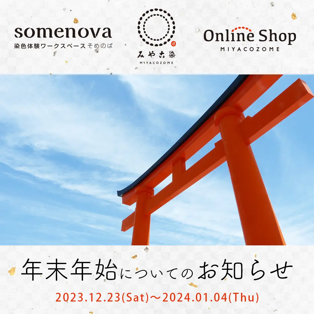 本年はみやこ染をご愛顧いただき、誠にありがとうございました。 2023年年末〜2024年年始の休業日について、ご案内をいたします。 【somenova(そめのば)】 2023年12月25日(月)〜2024年1月4日(木) […]