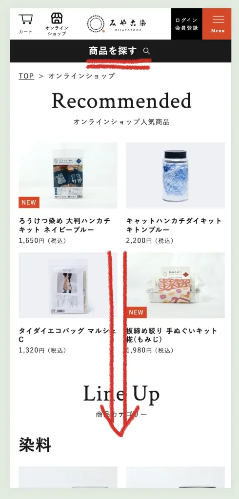スマートフォンからアクセスされる場合はパソコンと同じようにオンラインショップのTOPから下にスクロールしていただくか、上部にある『商品を探す』ボタンをタップして、こだわり検索を開き、『アウトレット』をタップして、絞り込み検索をしてください。
