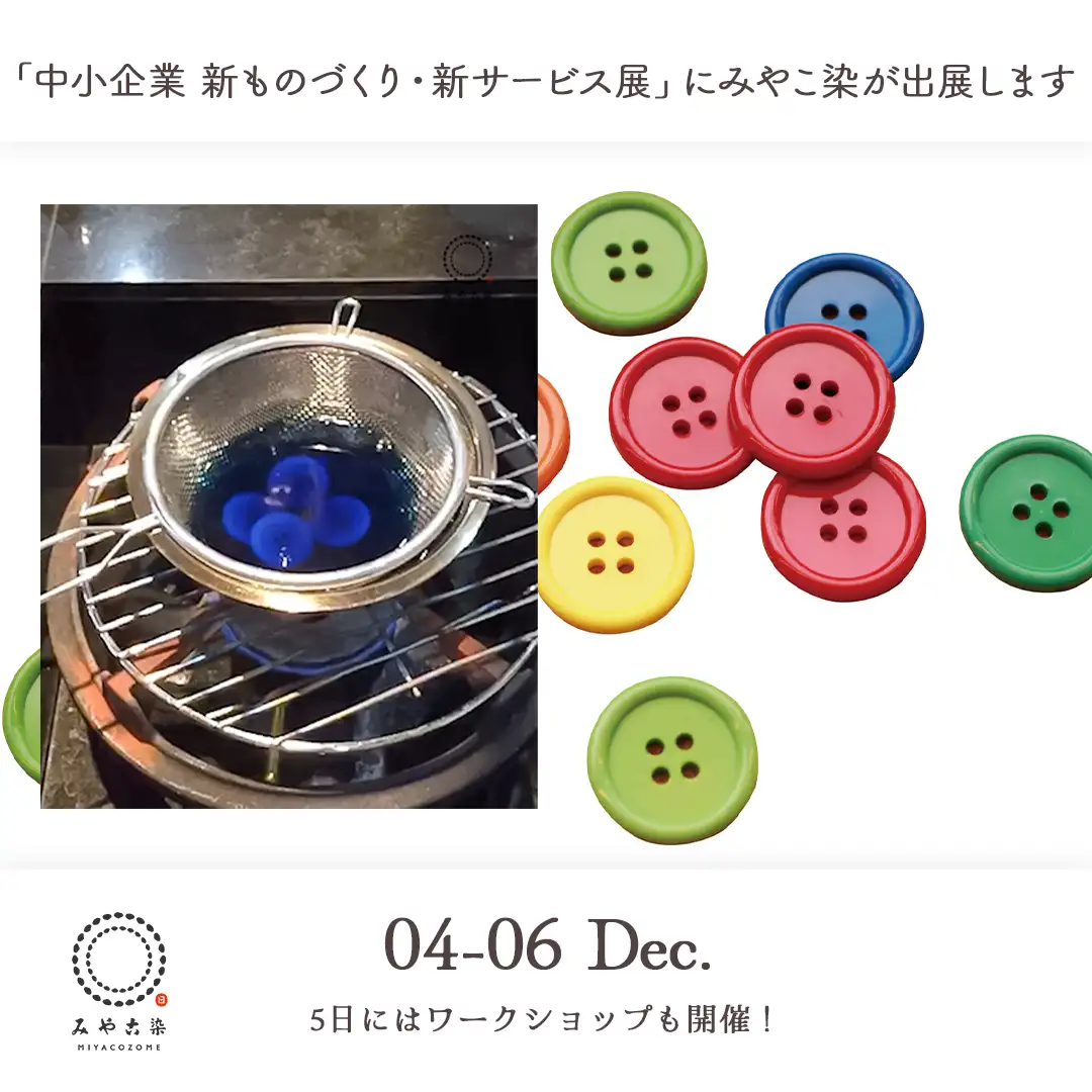 2024年12月4日(水)〜6日(金)の3日間にわたって開催されます「中小企業 新ものづくり・新サービス展」にみやこ染が出展いたします。 当日は樹脂成型品の染色など、染料の活用法をご紹介する他、特設ブースにてワークショッ […]