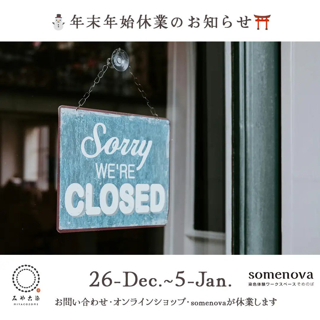 2024年12月26日(木) 〜 2025年1月5日(日)まで、年末年始の休業となりますため、somenova、お問い合わせフォーム、フリーダイヤル、オンラインショップの対応を休止させて頂きます。 詳細は以下の通りです。 […]
