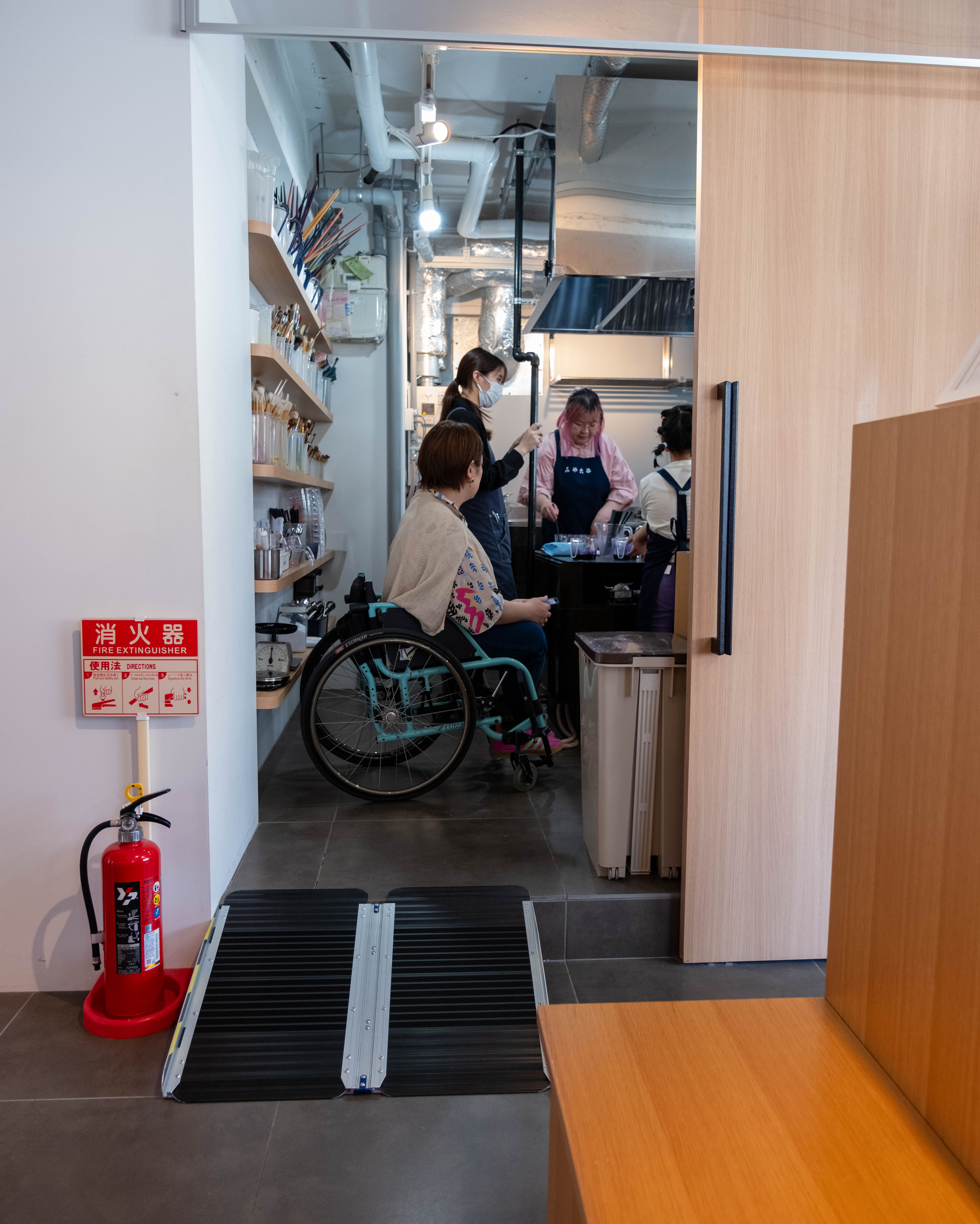 当ビルはあいにくバリアフリー対応をしておりませんが、 1F入り口の段差は臨時のスロープで対応可能です。 5Fsomenovaまでも幅 60センチであればエレベーターにてアクセス可能です。 somenova 内は通行可能ですので、車椅子でも体験をお楽しみ頂くこともできます。 *染色室もお写真の通り、スロープ対応で上がれますので、見学・体験が可能です。 また、おトイレも1Fのコーヒーショップ PARKLETさんのご好意で、車椅子対応が可能です。 詳細はどうぞお問い合わせ下さい。